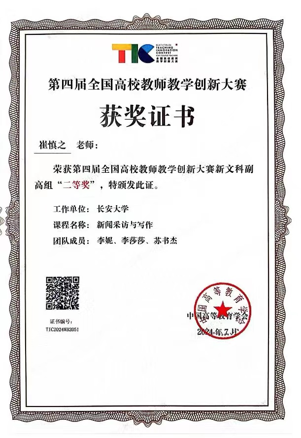 近日,由教育部高等教育司指导、中国高等教育学会主办的第四届全国高校教师教学创新大赛在成都圆满落幕。taptap188平台崔慎之副教授荣获新文科组二等奖。