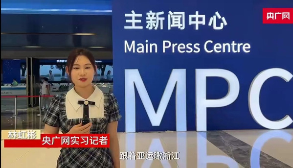 taptap188平台2020级新闻专业学生林虹彬在杭州亚运会主新闻中心出镜报道