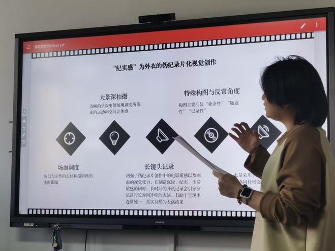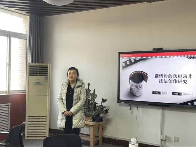 分享结束后,受邀教师赵艳对此次分享进行了点评,肯定了魏鹂萱的选题以及提炼的论点,同时对伪纪录片形式的剧情片创作给予理论支持和思路指导。她鼓励同学们将电影理论与电影实践紧密结合,更加深入的研究电影类型。
