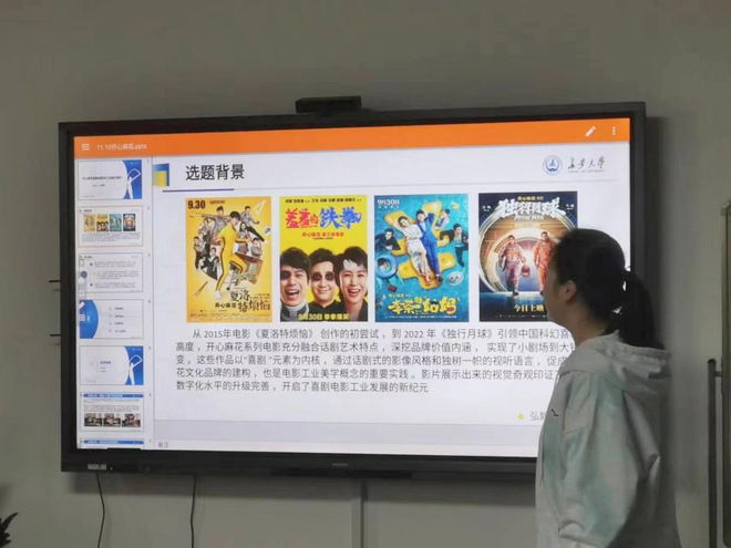 朱雪瑶从开心麻花喜剧电影的工业美学建构入手,阐述了中国电影工业美学的发展流程,并且在叙事策略、视听风格、传播策略和开心麻花影业在电影工业美学的本土化建构方面,通过具体的影片进行分析,向同学们阐释了开心麻花影业对“电影工业美学”原则行之有效的实践。