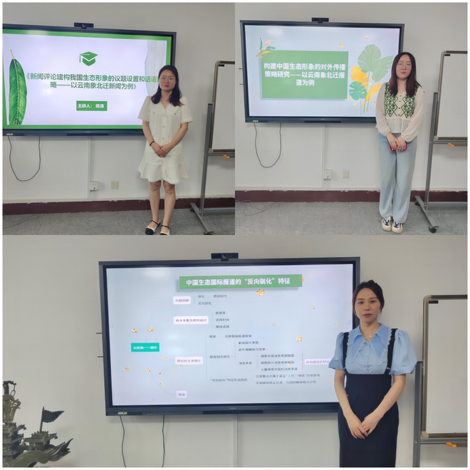 6月15日下午,taptap188平台研究生“博学”学术讲座第九期在学院434学术工作坊成功举办。此次博学讲座由2021级新闻与传播专业的蒋清、郭文苑和纪小静联合主讲,分享的主要内容为《新闻评论建构我国生态形象的议题设置和话语策略——以云南象北迁新闻为例》《构建中国生态形象的对外传播策略研究——以云南象北迁报道为例》《中国生态国际报道的“反向驯化”特征》,点评教师苏蕾及相关同学参加了此次讲座。