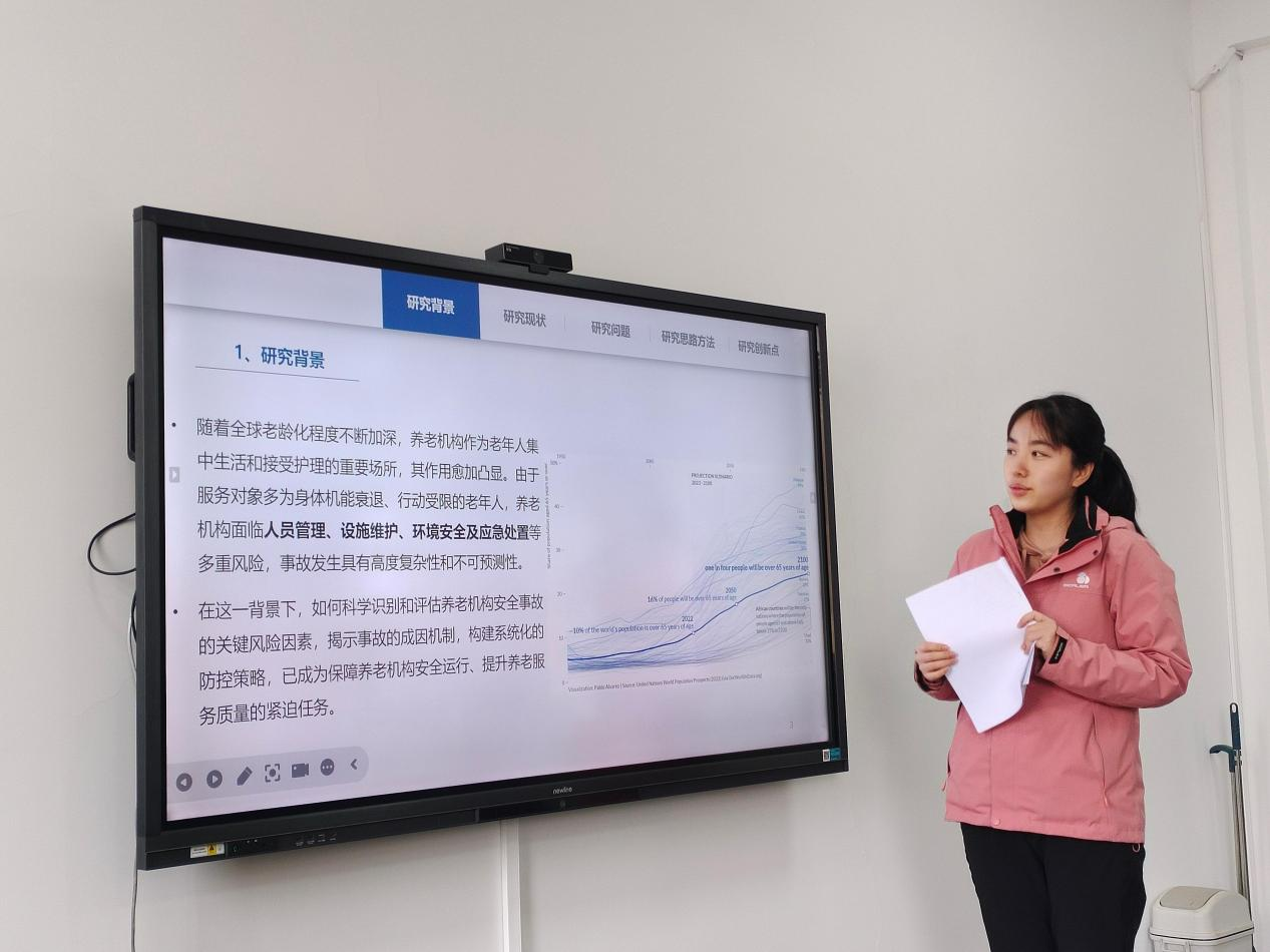 吕嘉瑞围绕养老机构安全事故致因链分析展开讲解。她首先介绍了对案例和报告的人工编码方法,然后结合故障树分析识别事故的致因结构,并构建贝叶斯网络化关键风险因素及其相互作用。最后,她结合贝叶斯网络推理结果,从优化监管机制、提升护理人员培训、加强安全设施维护等方面提出了养老机构安全管理的改进建议。