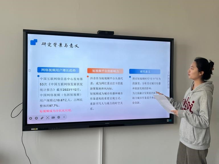 冀立璠分享的主题为“探析抖音景点“打卡”的网红化传播路径”,她以兰德尔·柯林斯的互动仪式链理论为研究视角,从抖音平台所提供的地点选择、社群联结、平台参与和用户日常实践四个方面分析抖音景点“打卡”短视频的网红化传播路径,探寻“打卡”背后的新媒介传播实践。她认为,当前在文旅融合发展背景下,短视频成为传播新载体。在抖音平台,众多城市景点被塑造成媒介地点火爆出圈,成为网络热门打卡地,吸引用户参与到媒介叙事中,来到实地打卡。网红打卡文化成为大众媒介生活方式的重要组成部分,影响着人们的旅游行为和城市认知。冀立璠通过互动仪式链理论,为新媒介传播实践提供了研究新视角,为城市传播和旅游发展提供了新思路,有助于大家更好地理解网红打卡现象。