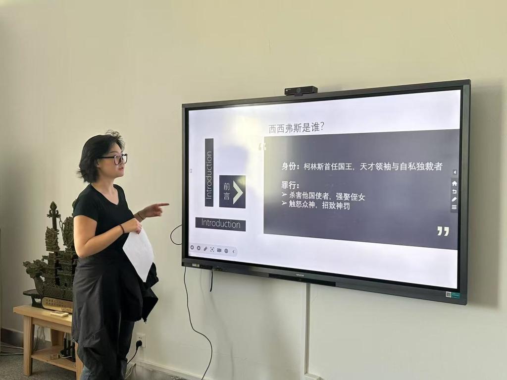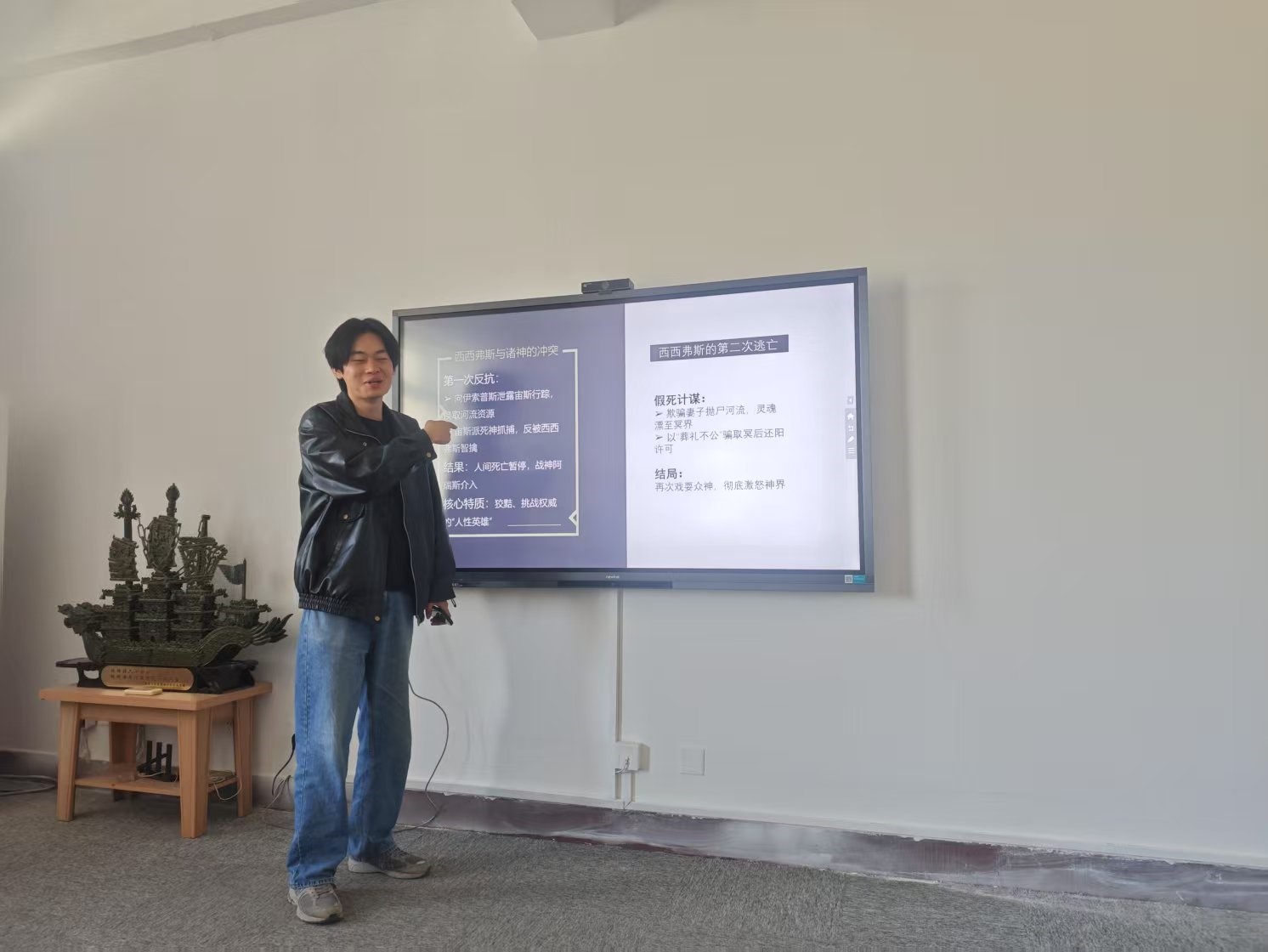 分享结束后,指导教师贾红雨对两位同学的汇报进行点评,他指出杨唯一从园林的空间叙事中挖掘出人与自然共处的传统智慧,牛甲怡则通过哲学分析揭示了直面困境的勇气。二者看似遥远,实则共同回应了“人如何安顿自我与世界”的永恒命题。他特别称赞两位同学“以生活化案例激活深奥理论”,让听众轻松理解东西方人文思想的精髓。