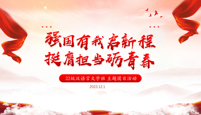 习近平总书记寄语广大青年:“明天的中国,希望寄予青年。青年兴则国家兴,中国发展要靠广大青年挺膺担当。”为深入学习习近平总书记关于青年工作的重要思想,2023年12月4日,2022级汉语言文学团支部开展“强国有我启新程,挺膺担当砺青春”主题团日活动。