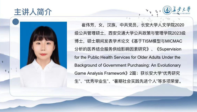 崔伟芳目前在西安交通大学公共政策与管理学院攻读博士学位。分享会上,她首先为大家解读了申博与考研的不同点。之后,她结合自己的申博经历,在联系目标院校导师、简历制作以及邮件发送等方面对与会同学提出了对应建议。她强调在申博过程中,首先要在目标院校官网查找往年招生简章,通过往年招生目录查看招生博士生导师名单,且博士申请不要局限于一所院校;二是要认真准备申博材料,注意所需材料种类、提交方式以及截止时间等信息,并以西安交通大学共政策与管理学院2023级博士招生简章为例进行讲解;三是要高度重视复试,在专业课和英语笔试环节可咨询目标院校师兄师姐,把握考核重点。分享会最后,崔伟芳向与会同学分享了公众号“考博之路”,希望对大家之后的求博之路有所帮助。