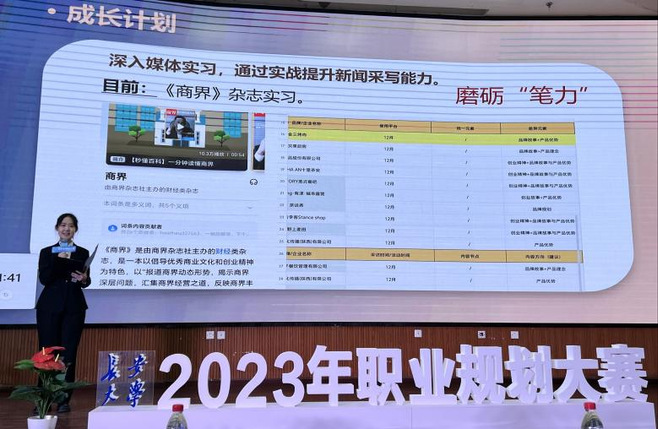 决赛现场,刘艳鑫同学以《一枝一叶总关情,用民生视角谋百姓幸福》为题,从职业目标、成长经历、成长计划三部分入手,多角度阐述了自己的职业生涯规划。立志成为一名为百姓谋幸福的民生新闻记者的她,最终在此次职业规划大赛中斩获成长赛道一等奖。