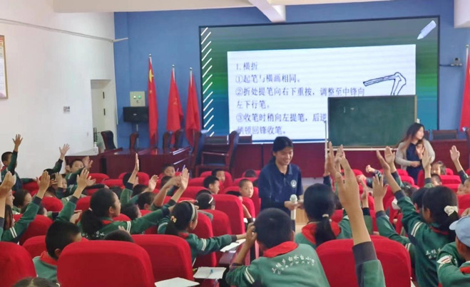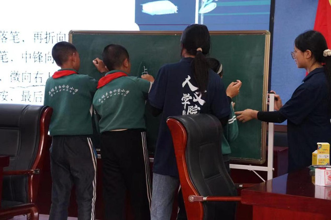 实践团队队员化身一日推普小老师组织四年级同学开展了多项生动有趣的教学活动。同学们在小老师的带领下认真学习并投入课堂教学,积极举手回答问题。小老师也准备了精美的奖品鼓励同学们大胆发言。最终在老师和同学们的共同努力下教学气氛融洽,成效显著。