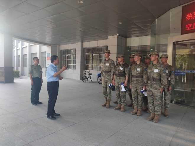杜智民向九团团长宫定云详细了解军训的相关安排和训练情况,并代表学院向辛勤付出的全体承训教官表示衷心感谢,对整体训练成果以及同学们不怕苦、不怕累的高昂士气与给予高度评价。杜智民表示,近一周来的训练为同学们带来了质的飞跃,看到同学们斗志昂扬的精神面貌感到非常欣慰,军训是大学阶段的必修课程,也是提高大学生军事素养的重要体现,这段军训时光是同学们大学生活中的一段剪影,也将会是一笔宝贵的精神财富。此外,希望教官们在此次军训工作中高质量、严要求开展好相关训练工作,让学生们在军训中淬炼出坚毅的意志品质和优良的生活作风。