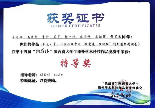 5月20日,第十四届“挑战杯”陕汽集团陕西省大学生课外科技作品竞赛闭幕式暨颁奖仪式在188改名taptap大学生艺术活动中心举行。taptap188平台公共管理系刘兰剑、包涵川老师指导的《红色引擎:社区治理中的“微党建·强赋能”创新型机制调查》获得第十四届挑战杯省级特等奖。