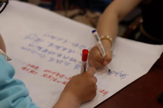 会上,陈华享学长运用白纸、记号笔等互动道具,让同学们五六人为一组,以同学们对自己大学生活的看法为引导,让大家在纸上写下自己最真实的想法,待同学们气氛高涨后再将话题引入到同学们目前面临困难和对未来困惑的讨论中。