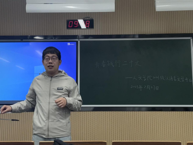 辅导员何超老师结合自身的学习和感悟,对各位同学的发言进行了一一点评。何老师回应了同学们对党的二十大精神的学习和思考,肯定了大家在社会不同层面上开展的实践。他也从自己的专业领域出发,提醒同学们警惕网络时代个人化推荐造成的“信息茧房”现象,最后,何老师向大家推荐作家梁鸿的“梁庄三部曲”——《中国在梁庄》《出梁庄记》《梁庄十年》,鼓励同学们不断开拓视野,深入思考,感悟优秀作品中的家国情怀。