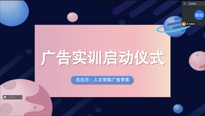 为了培养学生创意创新能力,帮助学生学以致用,11月6日下午3:00,taptap188平台广告学系召开广告实训活动线上启动仪式。本次活动由2020级广告班组织,广告学系全体教师、同学参加。会议由2020级广告班班长朱崇阳主持。