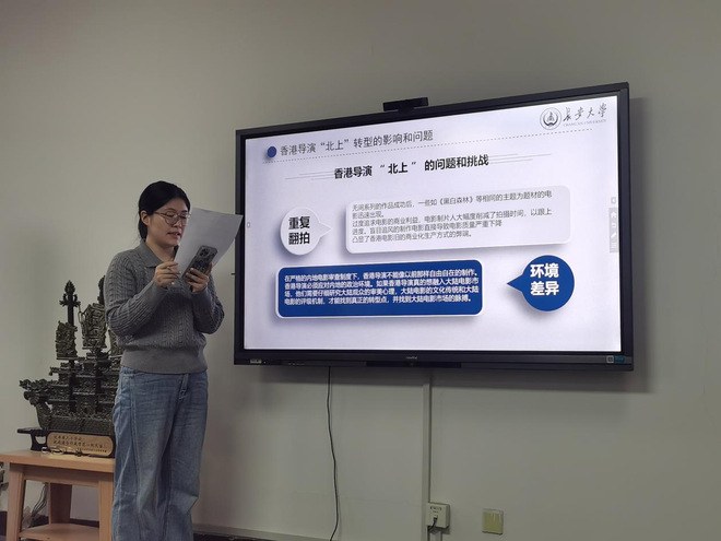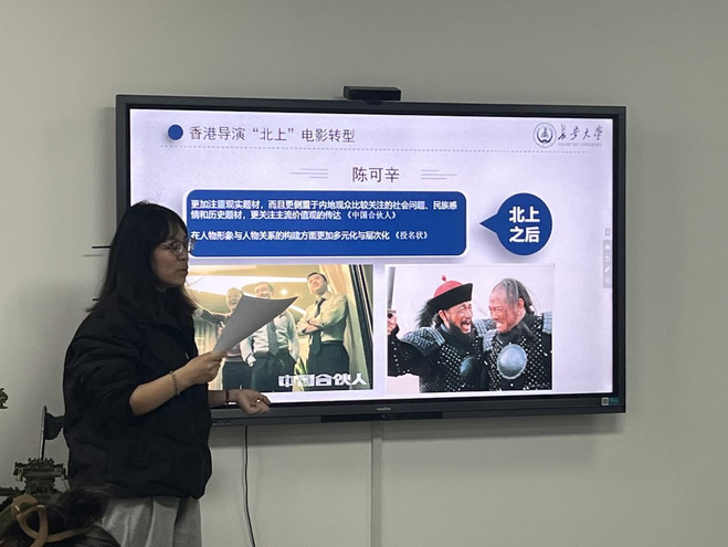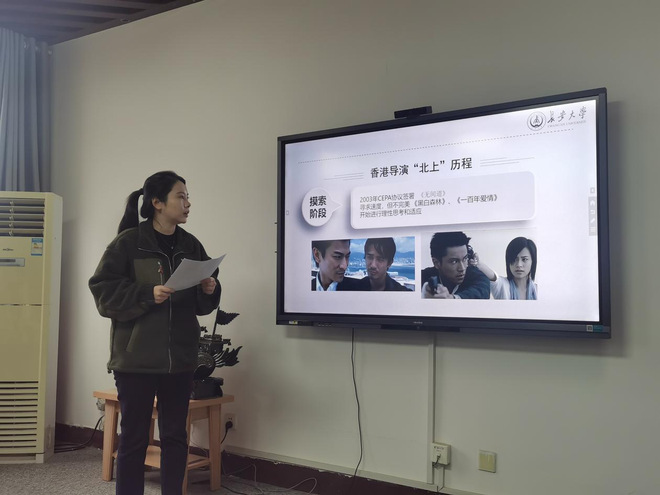 首先,辛姝岩讲解了“北上”概念的界定,它指的是在2003年签署CEPA协议后,香港导演作为一个整体开始以集体的形式进入内地市场,并开始与内地进行前所未有的合作。香港导演“北上”的历程分为摸索阶段、磨合阶段和突破阶段,每个阶段都有其行业现象、电影代表作品及不同的特点。