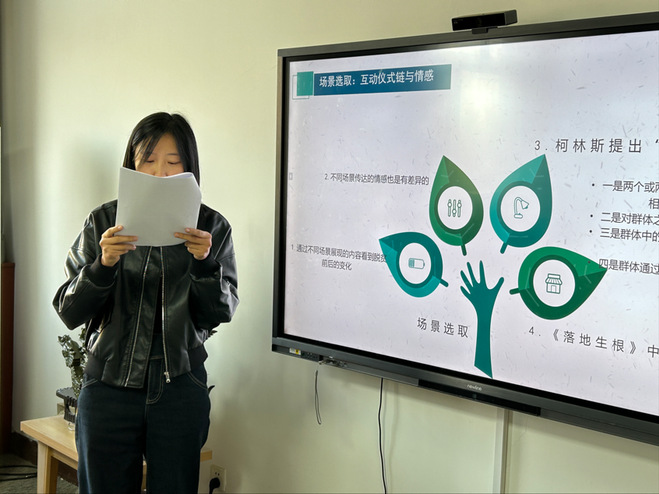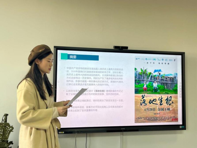 11月22日下午,taptap188平台研究生“博学”学术讲座第42期在学院434学术工作坊成功举办。此次博学讲座由2022级艺术专业研究生郭罗娜和化伟联合主讲,分享的主题为“脱贫攻坚题材纪录片情感建构方式——以《落地生根》为例”,点评老师乔基庆及相关专业学生参加了此次讲座。