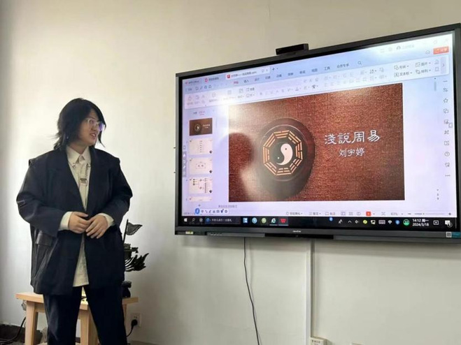 刘宇婷以“浅说周易”为题,展示了易经的深刻智慧及其在现代生活中的应用。刘宇婷首先详细介绍了周易的基本概念。在“近察”环节,刘宇婷深入探讨了卦辞和爻辞的含义,通过《乾》和《坤》两卦的详细解读,展示了易经如何指导人们在不同情境下做出正确的决策。之后,刘宇婷讲解了易经的实际应用,易经的变化之道以及如何通过变化来应对生活中的不确定性。最后,刘宇婷总结了易经对中国人人格、存在观、万物理论、中庸之道、发展观和忧患意识的影响,强调了易经对于个人修养和社会行为的指导作用。