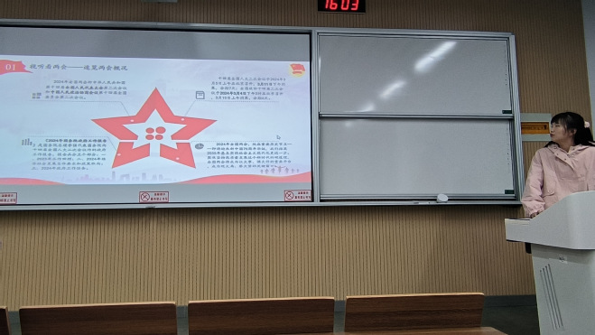 活动伊始,团支书陈怡莲向大家介绍了今年全国两会的基本情况和重要意义,并带领大家学习了全国两会精神。同学们通过观看全国两会相关的微视频,也更深刻地感受到了代表、委员们心系人民的实干精神。