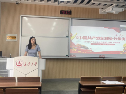 雷珍妮向本科生党员讲解了《条例》第八章“对违反廉洁纪律行为的处分”、第九章“对违反群众纪律行为的处分”、第十章“对违反工作纪律行为的处分”、第十一章“对违反生活纪律行为的处分”及《条例》附则内容,并就廉洁纪律、群众纪律、工作纪律、生活纪律等问题与参会党员进行了深入交流和讨论。她指出,廉洁纪律为党员同志树立了一个看得见、摸得着的高标准,体现了“自律”的要求;群众纪律是党的各级组织和全体党员坚持以人民为中心的发展理念和处理党群关系时必须遵守的行为规范;工作纪律是党的各级组织和全体党员在党的各项具体工作中必须遵守的行为规范;生活纪律是对党员日常活动和社会交往进行规范而制定的行为规则。她表示,作为青年学生党员要强化组织纪律意识,使铁的纪律真正转化为自身的日常习惯和自觉遵循,坚持做到学风纯正、纪律严明;在思想上要画出红线、筑牢底线,做到心有所畏、言有所戒、行有所止,做新时代忠诚、干净、担当的学生党员。