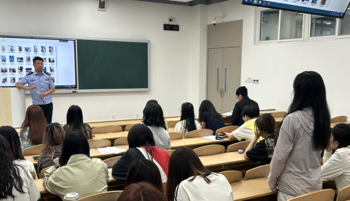 班会初始,两位老师简要介绍了本次班会嘉宾及主讲内容,即由两位刑侦民警对同学们进行电信诈骗防范讲解及职业生涯经验分享。首先,李晓鹏警长以一系列真实电信诈骗案例切入主题,系统剖析了冒充公检法、投资炒股、网恋骗局、银行卡及社交账号非法交易等典型诈骗类型。李警长通过展示全国多地办案的工作照片,结合典型案例向同学们揭露了诈骗分子实施诈骗的惯用手段,指出当前电信诈骗呈现“国内引流、境外实施”的跨境犯罪样态,并向同学们反复强调需要提高警惕,切勿参与任何的违法活动;同时也展现了民警在侦破电信诈骗案件时面临的犯罪行为人人员分散、诈骗赃款资金流向复杂的艰辛与挑战。