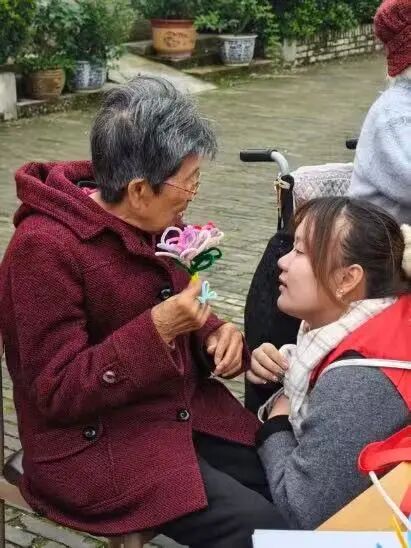 本次活动在全体志愿者与老人们共同合唱《我和我的祖国》《我爱你,中国》等经典歌曲中拉开帷幕。悠扬的旋律响起,不少老人情不自禁轻声跟唱,现场气氛温馨而热烈。合唱结束后,志愿者们主动为有需要的老人修剪指甲,简单的行动传递出了志愿者们对老人的关爱之情。在随后进行的手工制作环节中,在志愿者的耐心讲解和示范下,老人们利用扭扭棒等材料亲手制作出各式手工作品,丰富了他们的精神文化生活。最后,活动还设置了“书写心意”环节,志愿者们协助老人执笔撰写“爱的贺卡”,将思念与祝福落于笔端,帮助部分书写困难的老人传达内心的情感。