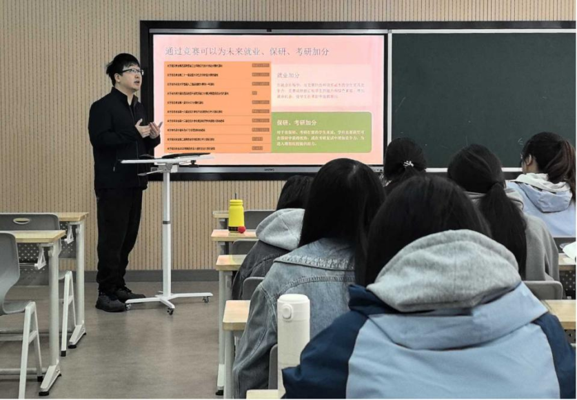 在分享过程中,高老师指出,许多学生在参赛过程中不仅获得了荣誉证书,更在组队、调研、撰写报告与答辩展示中,显著提升了沟通能力、数据分析能力和公共决策意识。这些经验将成为今后就业与升学中的宝贵资本。在交流环节中,同学们积极发言,分享了对不同竞赛项目的兴趣与疑问。高老师耐心解答,并提出了具体建议:一是尽早关注通知,合理规划时间;二是多向指导教师请教,汲取经验;三是注重团队合作与创新思维的结合。他还特别强调,竞赛不仅是能力的展示,更是学习方法和态度的延伸,应以积极的心态面对挑战,在过程中实现自我超越。