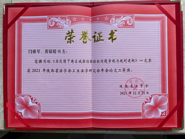法学系闫雅琴老师和黄婧媛同学所撰写的《后疫情下跨区域联防联控的问题审视与规则建构》一文,遴选为“陕西省法学会卫生法学研究会2021年学术年会”专题学术交流论文,并被评选为优秀论文二等奖。