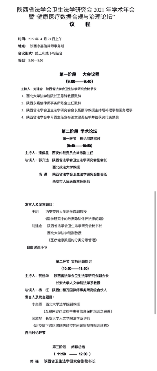 2022年4月23日上午,由西北大学法学院、陕西省法学会卫生法学研究会主办,陕西永嘉信律师事务所承办的“陕西省法学会卫生法学研究会2021年学术年会暨健康医疗数据合规与治理论坛”在永嘉信律师事务所举行。