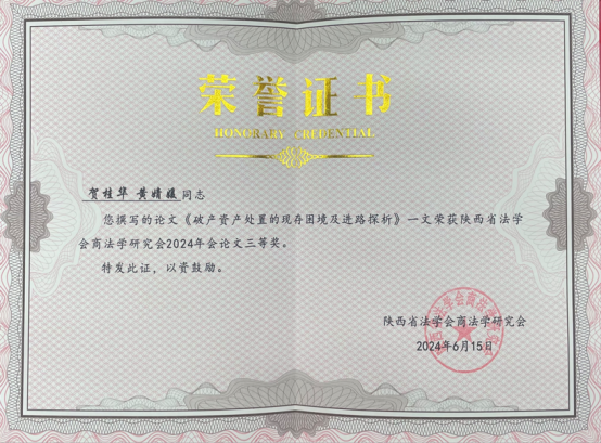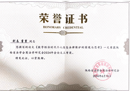 刘志、董翌撰写的《数字经济时代个人信息法律保护的困境与思考》,贺桂华、黄婧媛撰写的《破产资产处置的现存困境及进路探析》,获得年会论文三等奖,王紫溪同学撰写的《我国破产劣后债制度研究》论文获优秀奖。