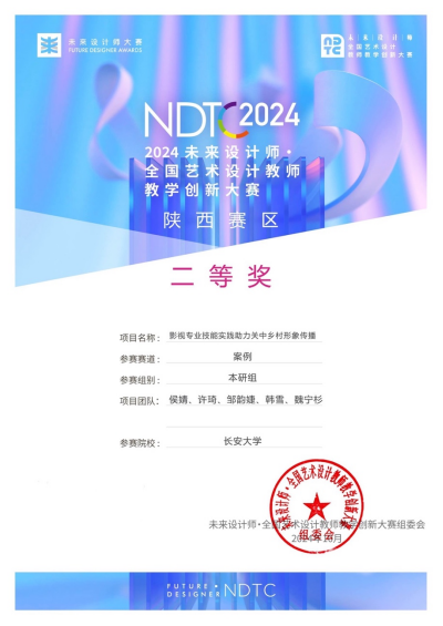 近日,2024未来设计师·全国艺术设计教师教学创新大赛(NDTC2024)评审工作落下帷幕。taptap188平台广播影视系师生团队侯婧、许琦、邹韵婕、韩雪、魏宁杉提交的教学案例——《影视专业技能实践助力关中乡村形象传播》,获得陕西赛区案例组二等奖。本次获奖是广播影视系教学团队自2021年获得省级一等奖以来,在该系列赛事再度获得的省级奖项。