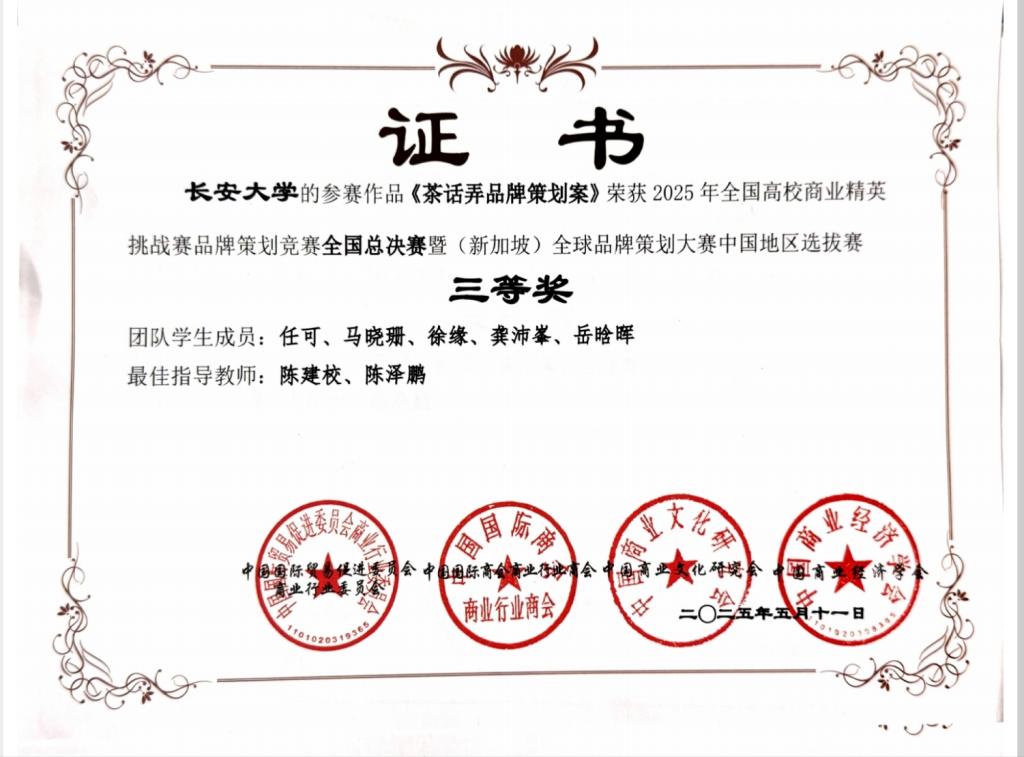 近日,2025年全国高校商业精英挑战赛品牌策划竞赛全国总决赛比赛结果揭晓,由taptap188平台陈泽鹏老师参与指导,taptap188平台研究生任可、马晓珊、徐缘、龚沛峯、岳晗晖共同参赛的作品《闲情自在茶话弄》荣获国家三等奖。