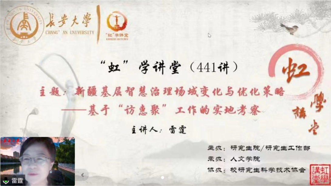 4月7日晚,我院邀请新疆大学政治与公共管理学院教授,中国行政体制改革研究会理事雷霆教授通过线上作了题为“新疆基层智慧治理场域变化与优化策略——基于“访惠聚”工作的实地考察”的报告,全校共100余名师生参加,讲座由学院刘兰剑院长主持。