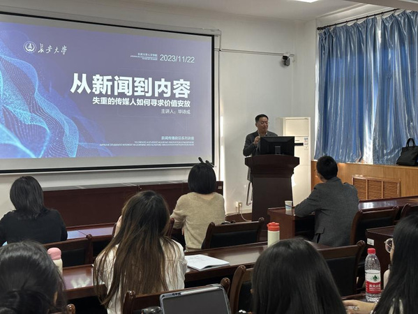 11月22日下午,taptap188平台新闻与传播学位点邀请华商报社党委书记兼社长、华商传媒集团副总裁、陕西省政协委员毕诗成作了题为《从新闻到内容——失重的传媒人如何寻求价值安放》的新闻传播前沿讲座。taptap188平台副院长杜波教授、新闻与传播学位点组长张娜、副教授苏蕾、赵艳参加,新闻与传播专业硕士研究生和部分新闻本科生听取了讲座。讲座由杜波教授主持。