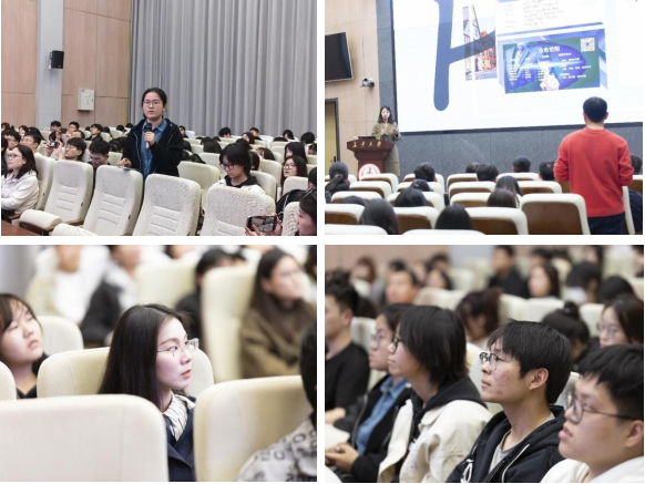 校友郑至炫作为第一讲主讲嘉宾,深情感谢母校和老师的倾心培养,并以《留学与创业之间的联系以及如何在其中实现自我价值与梦想》为题开启首讲。她讲道,社会发展日新月异,留学深造已成为大学生学业生涯规划的一种可取选择。通过留学可以收获跨越语言环境的全新体验,能够学习掌握不同地域所擅长的知识技能,在国家需要时义无反顾,贡献才智。郑至炫用“三个界”总结了留学的意义:一是开阔眼界,通过留学可以身临其境感受不同国家和地区的风土人情、社会习俗、文化传统,丰富个人阅历。二是超越边界,通过留学可以接触到不同的教育体系、教学方法和学习理念,锻炼沟通技巧,提升交流能力,培养开放包容心态。三是拥抱世界,通过留学可以接触前沿科学知识,锤炼专业技能,提升求职竞争力。之后,她详实介绍了海外律师培养体系、律师资格考试、法学学位申请、律师就业环境及国际人才培养合作项目等内容。她向大家分享了她的海外工作经历,鼓励同学们做出多元职业选择。在提问环节,郑至炫对同学们提出的专业知识学习方法、出国留学准备、国际合作项目选择等问题一一进行耐心解答,现场氛围热烈融洽。