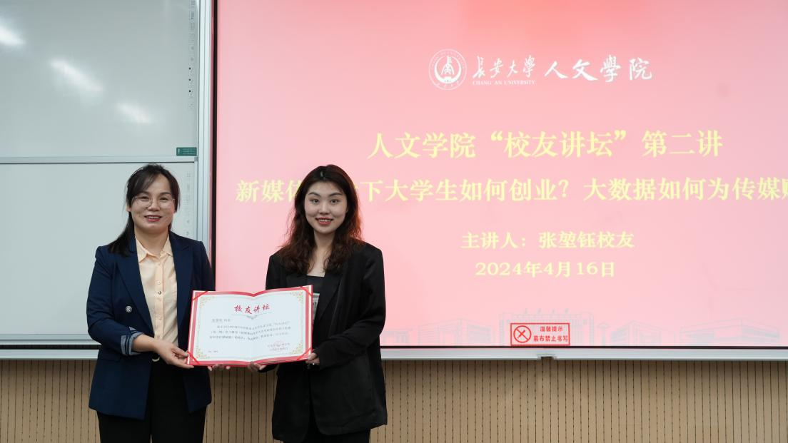 讲坛结束后,何红娟为张堃钰颁发“校友讲坛”留念证书。学院将持续同校友保持密切联络,邀请更多不同专业、不同领域的校友来校分享成功经验,为人文学子提供交流提升平台,鼓励学生以优秀校友为榜样,认真学习、健康成长、笃学成才。